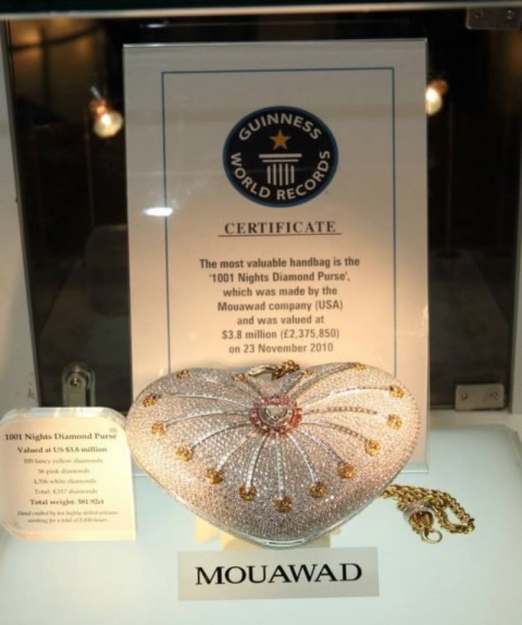 The $3.8 million Mouawad 1001 Nights Diamond Purse holds a Guinness World Record, and was invented by Mouawad jewellers. It took 8,000 hours from ten artisans and is adorned with more than 4,500 diamonds totalling 381.92 carats. Designed by Robert Mouawad, it has been listed among the most expensive bags.