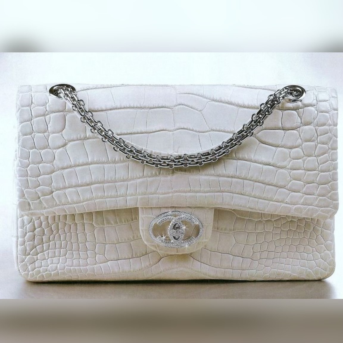 The Chanel Diamond Forever purse, modeled after the Classic Flap shape, was introduced by Karl Lagerfeld. The bag has white gold hardware, including a 3.56-carat diamond-encrusted clasp.