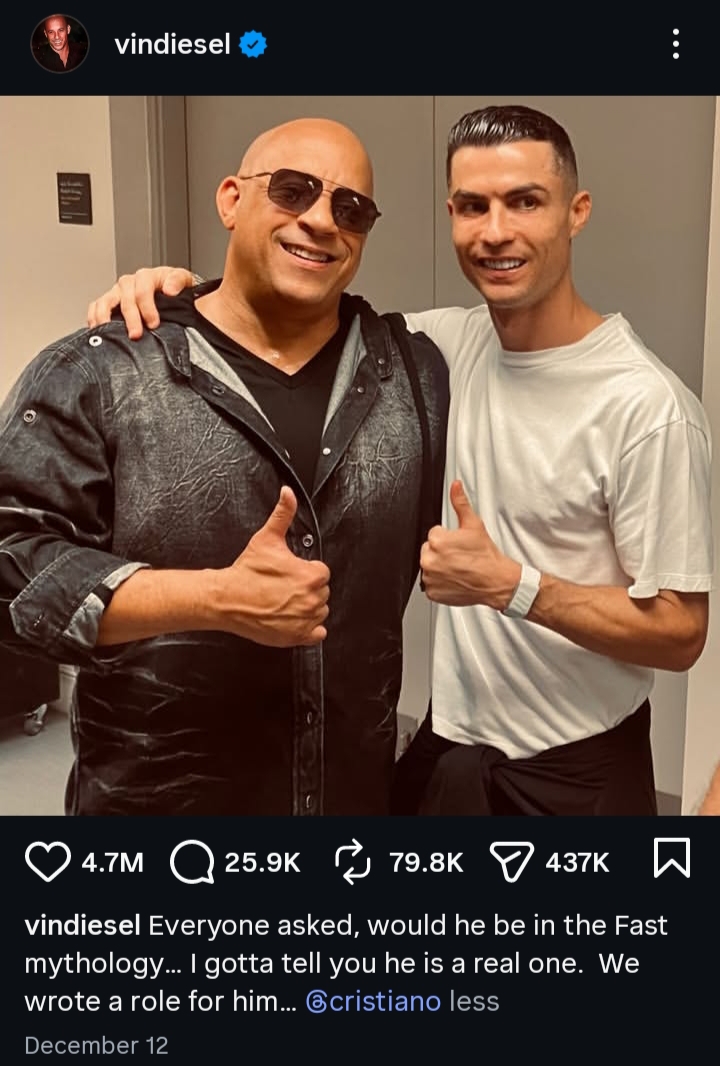 The football star is being linked to the Fast & Furious franchise after actor and producer Vin Diesel hinted online that a role may have been written for Ronaldo. Diesel shared a photo with Ronaldo online, raising questions about the player’s possible involvement in the next film.