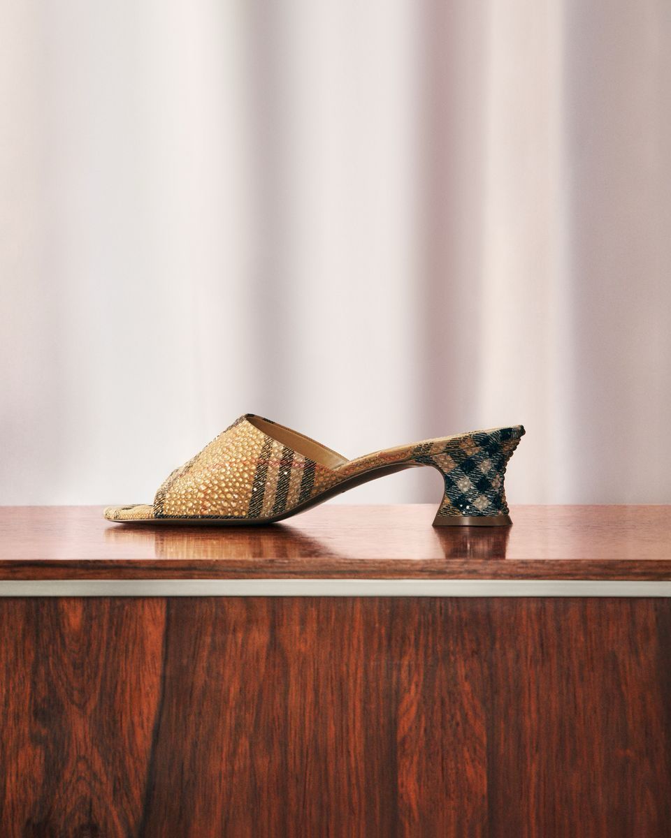 The British label enhances its signature plaid with crystal accents, while Sloane mules, Bridle handbags, and deep-red silk scarves are finished with a crystal detailing.