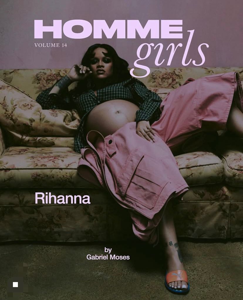 When Rihanna posted the cover for HOMMEGIRLS Volume 14 on Instagram, rumours started to circulate. Wearing a plaid blouse and pink cargo trousers, she was spotted posing with her baby bump prominently displayed. “HOMMEGIRLS VOLUME 14 feat. “My next fashion killa,” she said in the caption.