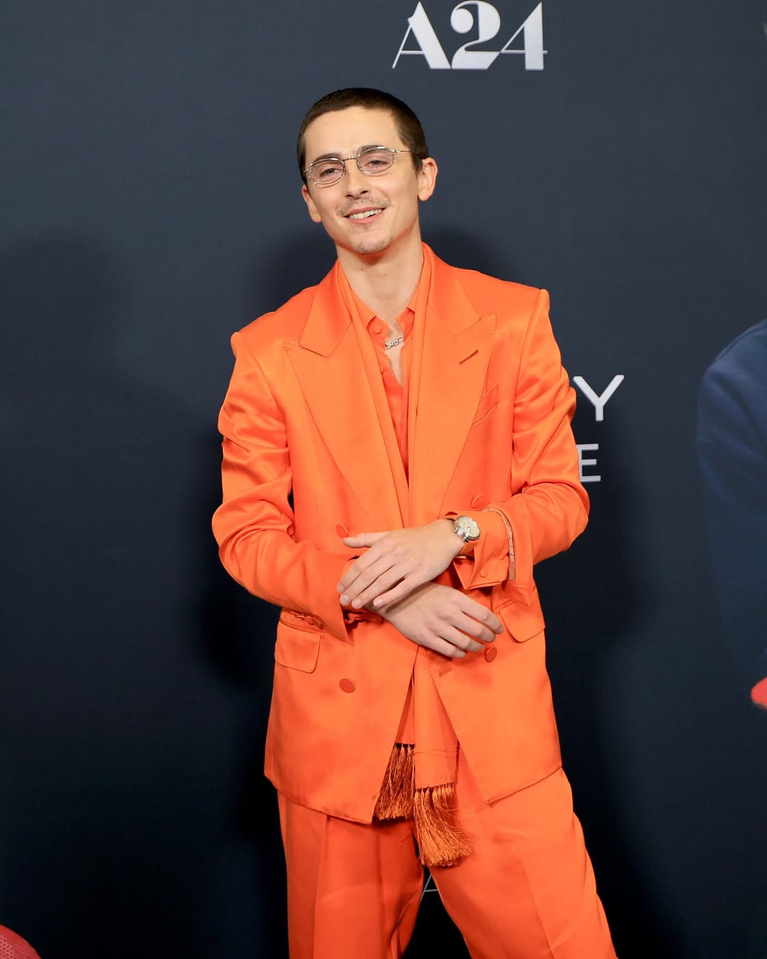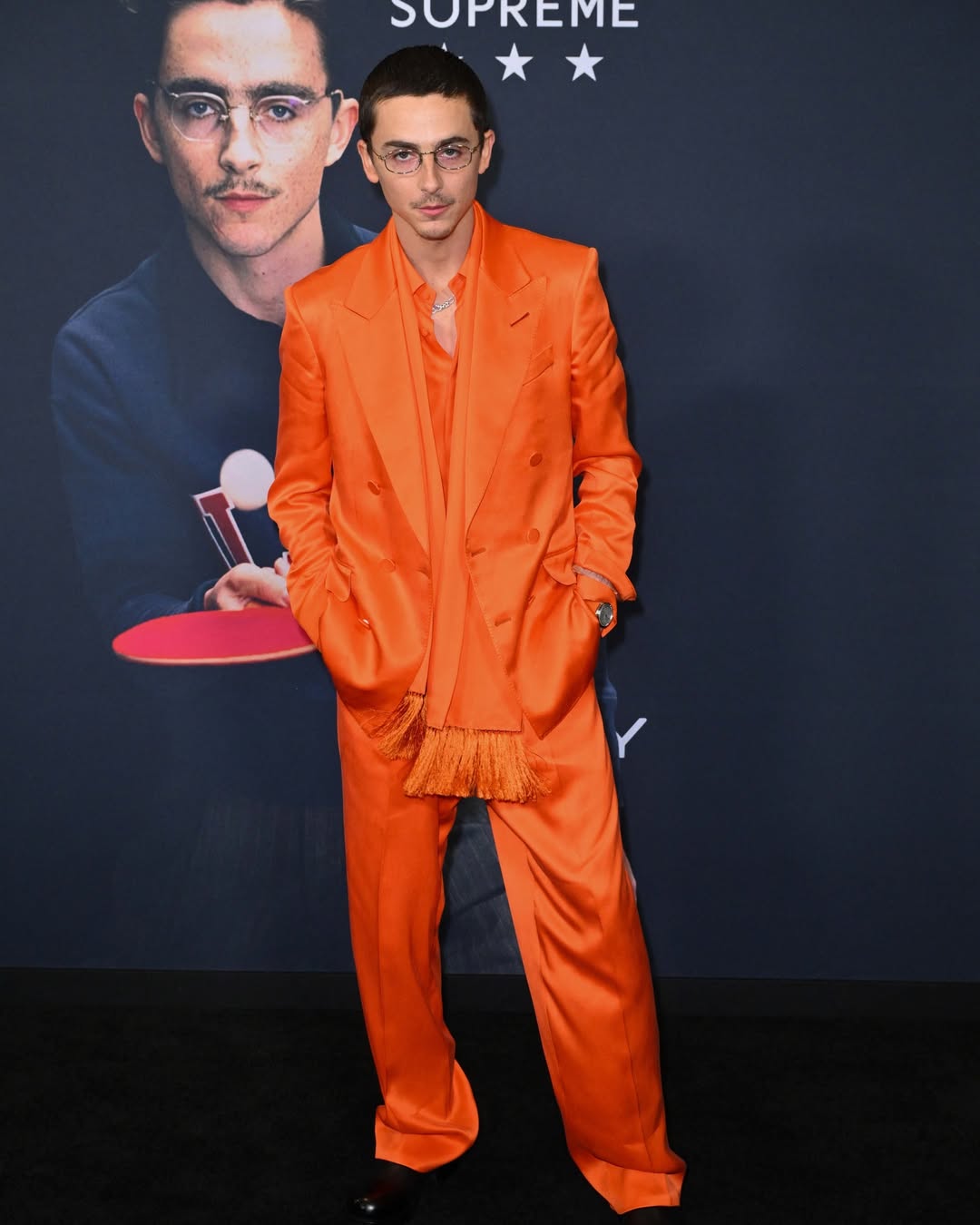 Timothée Chalamet and His Mom Nicole Twin in Marty Supreme Orange. Timothée Chalamet appeared on the red carpet with his mother, Nicole Flender. The actor embraced the film’s signature orange, with his mother mirroring his look. Chalamet wore a sharply tailored bright-orange Tom Ford suit designed by Haider Ackermann.