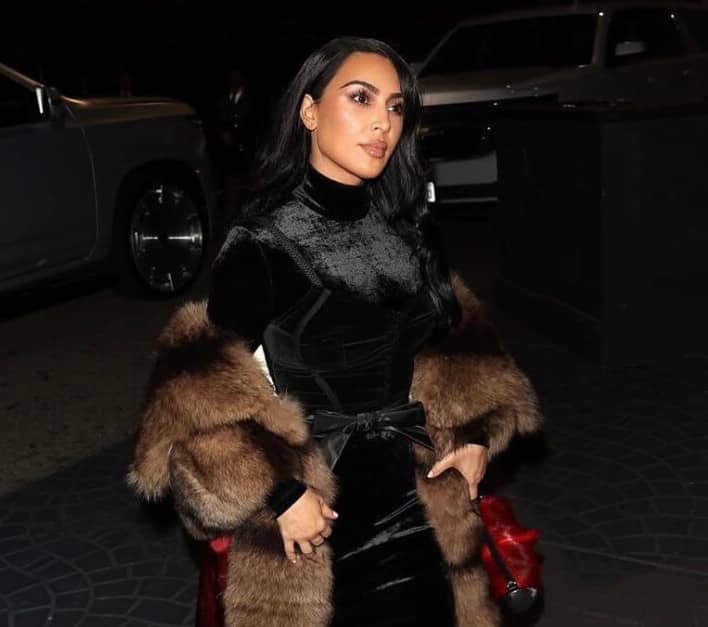 Kim Kardashian Attends Skims Holiday Party in Velvet and Fur