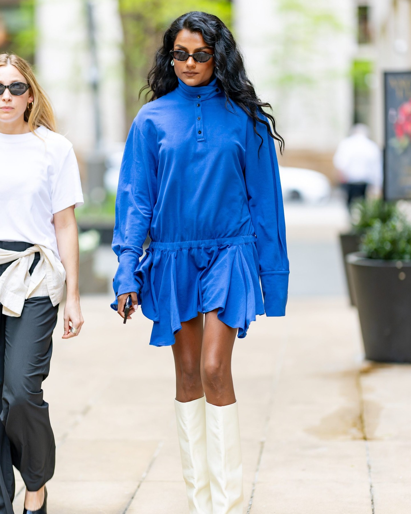 Simone Ashley wears a royal blue mini dress that has a sporty button-up high collar and a playful ruffled hem, she wears white knee-high boots and sun glasses to complete the look.