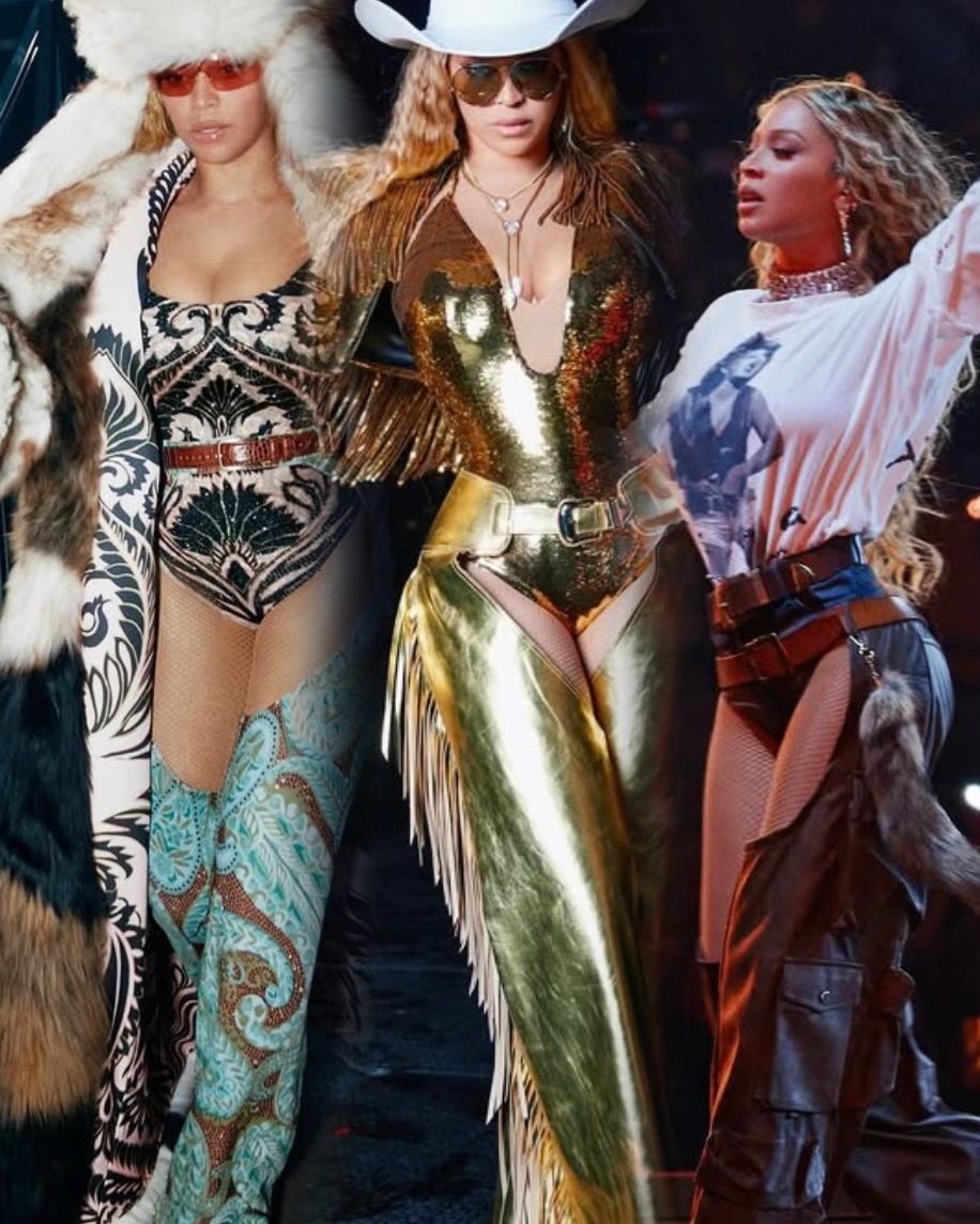 The concept of her outfits is a blend of Western/cowboy fashion with high-glam couture, celebrating Beyoncé’s Black cowboy and American heritage.