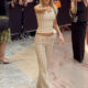 The bodice featured a corset-like design, with a sweetheart neckline. According to reports, the sleeveless saree was designed by hand, with delicate detailing, and had a cinched waist. Her dress, from the archives of Manish Malhotra, was appropriate for the occasion.