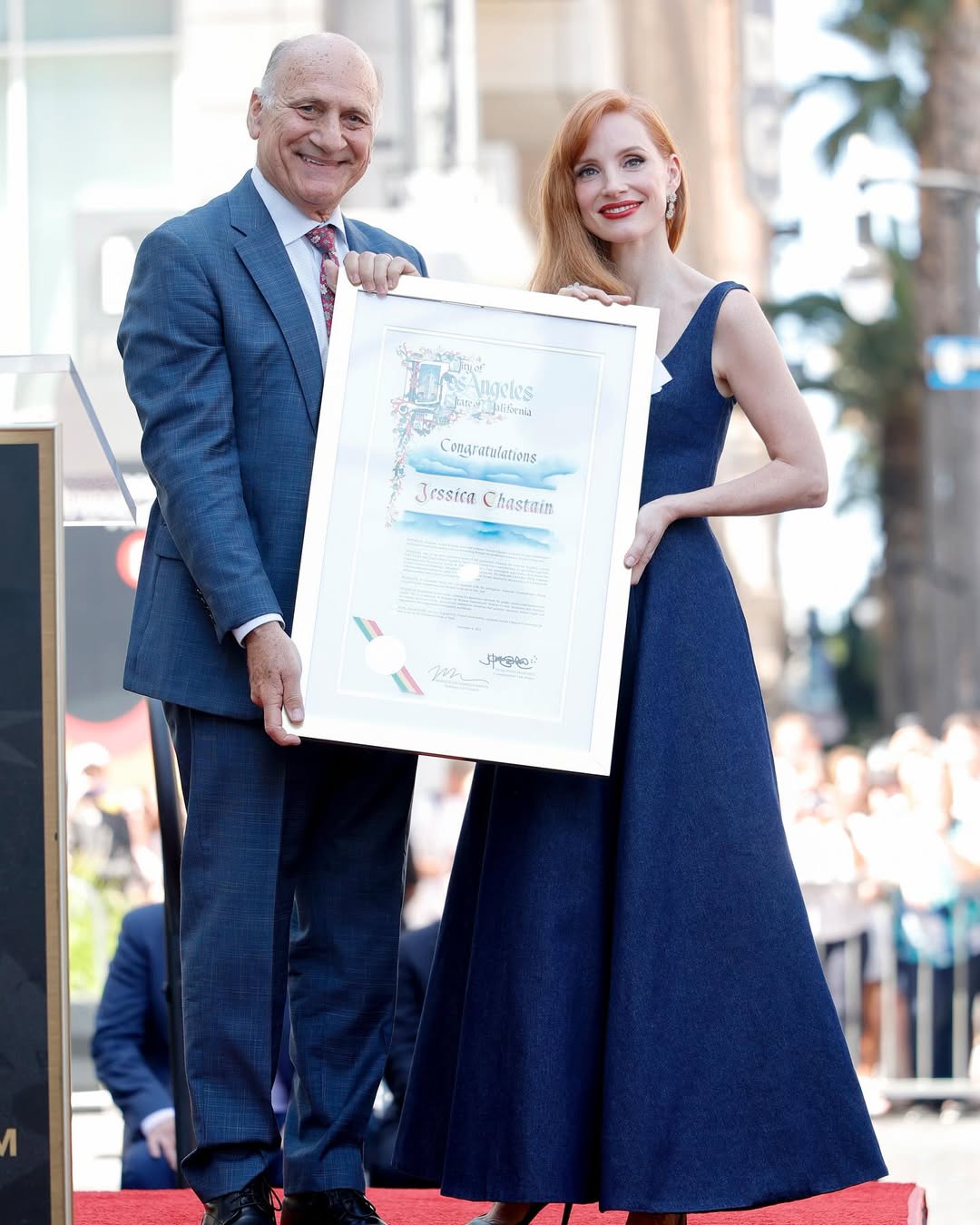 Jessica Chastain Accepts Walk of Fame Star in Denim Full-Length Dress