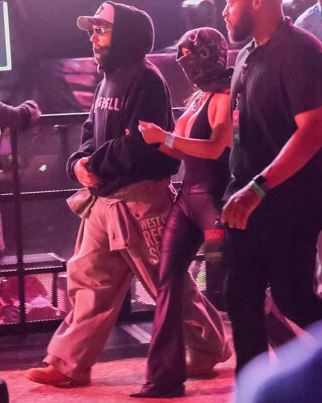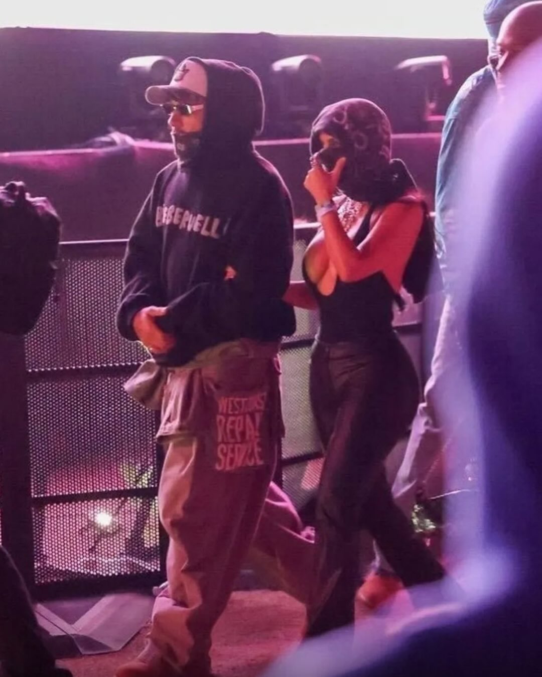 Both dressed in a way that allowed them to blend into the crowd. Kardashian wore a plunging black Skims tank tucked into leather pants, a Chrome Hearts scarf wrapped around her face and multiple silver necklaces. Hamilton wore with a black “Bieberchella” hoodie, Kapital cargo pants stamped with “West Coast Repair Service,” a white baseball cap and a bandana covering his face. Both wore low-profile looks suited to a crowd setting.