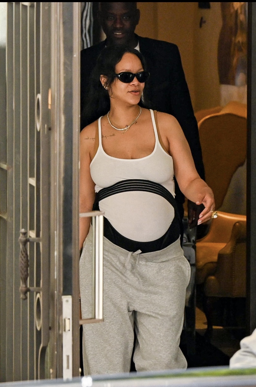 Rihanna’s choice to wear the belt over her bump transformed a typically discreet piece into the centerpiece of her outfit. Instead of tucking it away, she owned it—layering it over her tank top, as if to say, “This is part of the look.” It gave just the right balance of ease, grace, and quiet power.