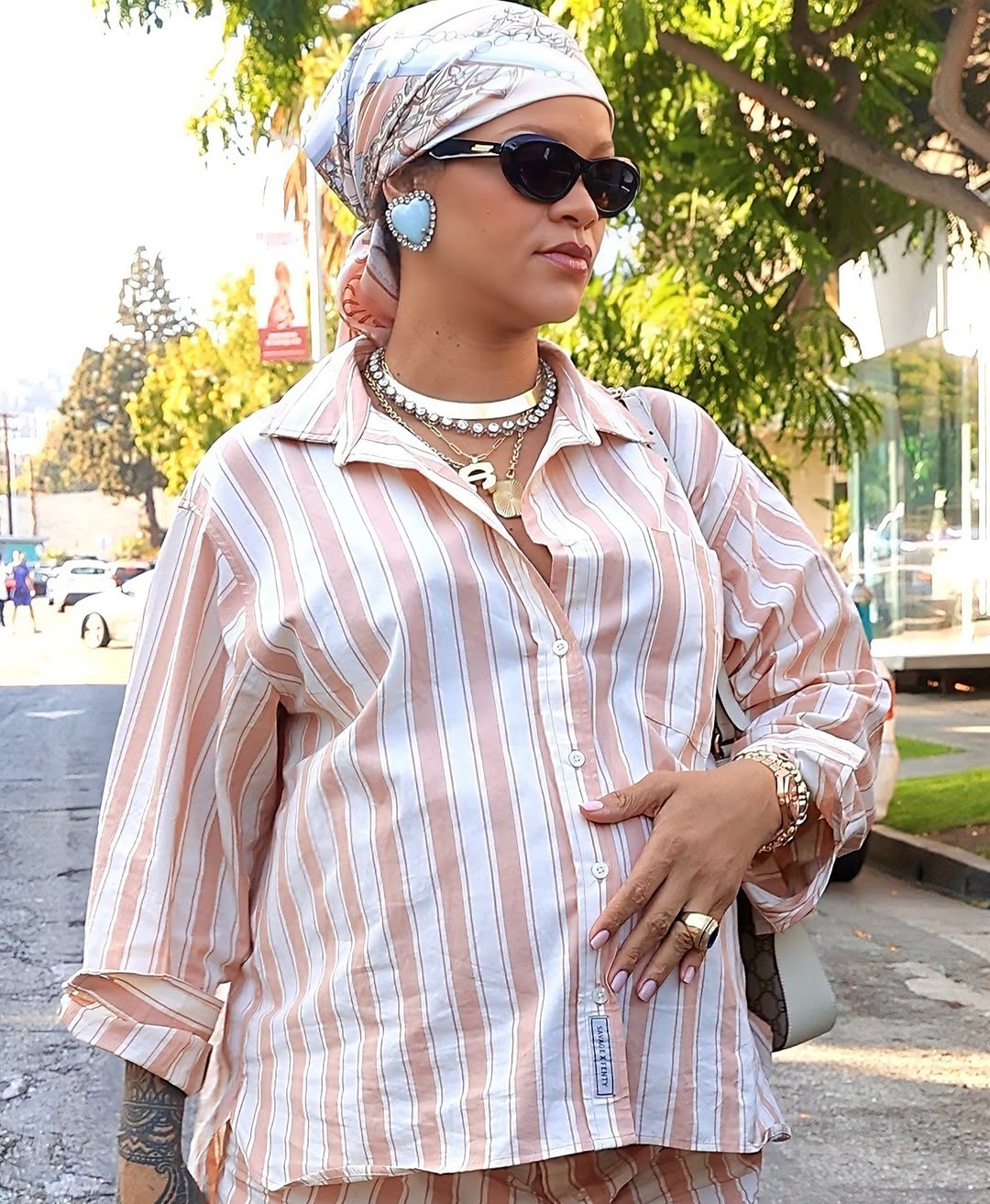 And when it comes to accessories, Rihanna never misses. For this outfit, her choice was bold – from layered gold chains to a single statement ring, a wristwatch, and bracelet topped off with her signature stylish shades. The most playful detail was her headscarf.